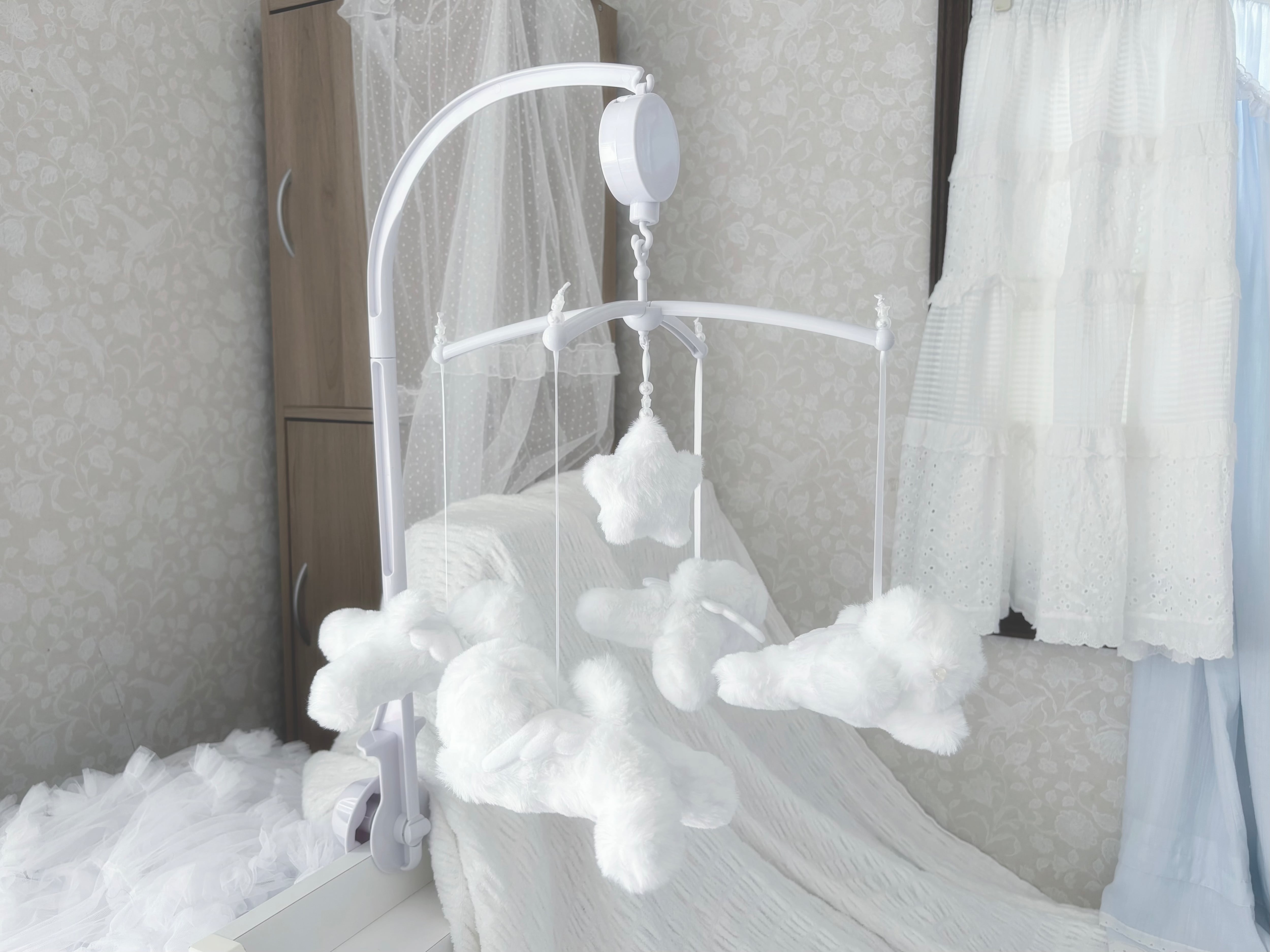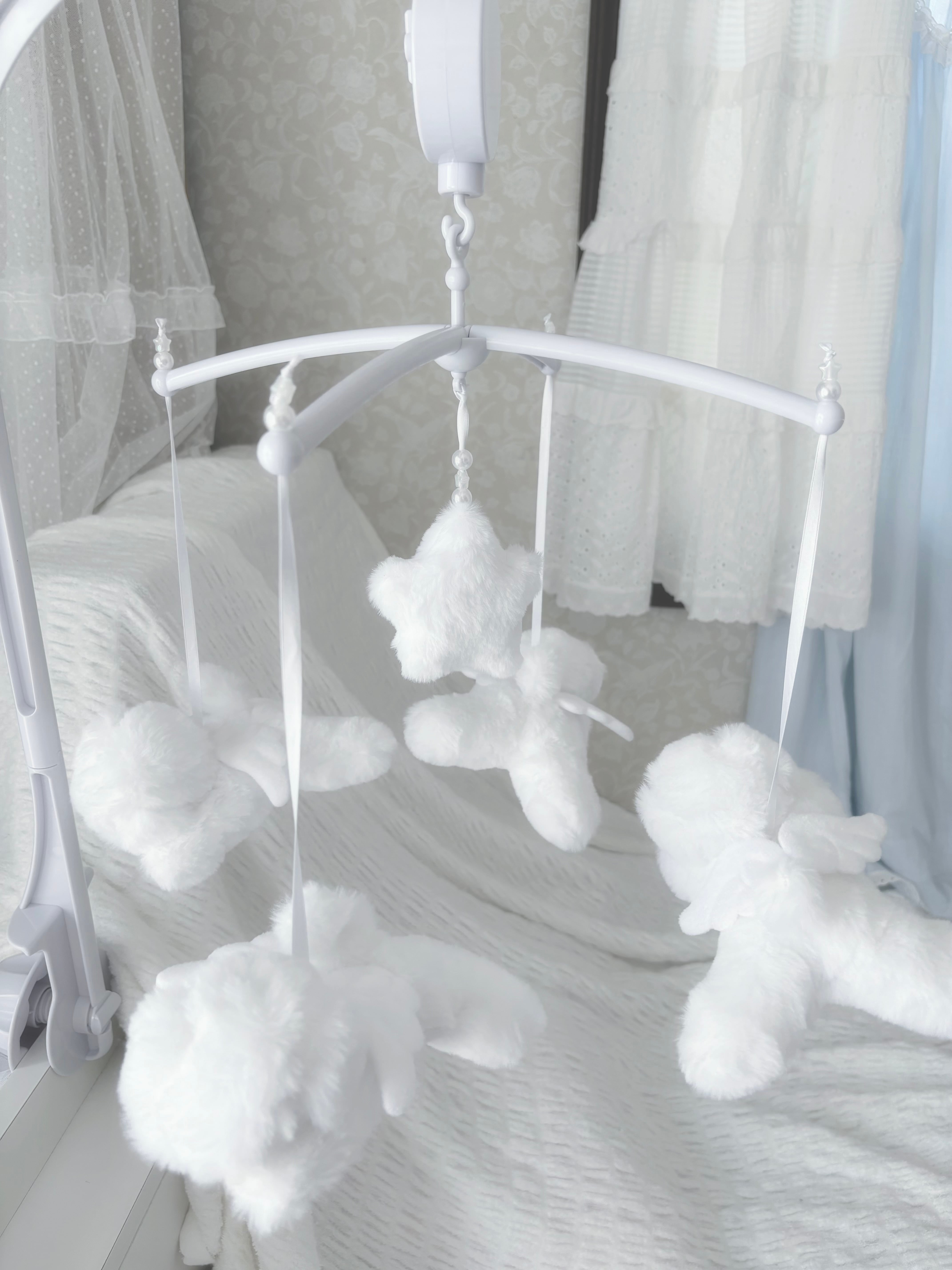 ベッドの縁に取り付けたり、取り外してリボンで吊るすこともできます。